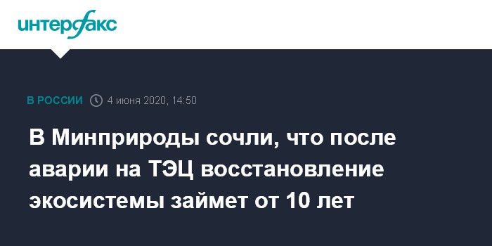 Москва. 4 июня. INTERFAX.RU - На восстановление экосистемы после разлива дизельного топлива на ТЭЦ-3 Норильско-Таймырской энергетической компании потребуется не меньше десяти лет, заявила замминистра природных ресурсов и экологии Елена Панова. По ее словам, в обсуждении проблемы участвуют экологи, эксперты, представители "Норникеля".