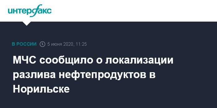 Москва. 5 июня. INTERFAX.RU - Розлив нефтепродуктов в Норильске локализован, собрано более 200 тонн горюче-смазочных материалов, сообщили "Интерфаксу" в пресс-службе МЧС России.