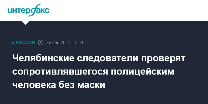 Москва. 5 июня. INTERFAX.RU - В Магнитогорске следователи проверят инцидент с участием местного жителя, который применил силу к полицейскому и пытался сбежать. Сотрудник полиции сделал ему замечание за появление в общественном месте без маски, сообщили в ГУ МВД Челябинской области.