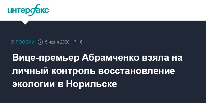 Москва. 5 июня. INTERFAX.RU - Вице-премьер Виктория Абрамченко взяла на личный контроль восстановление окружающей среды в Норильске после совещания у президента России, сообщила ее пресс-служба.