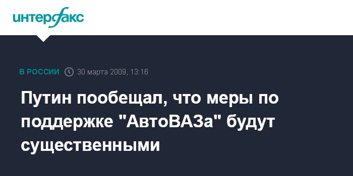 Москва. 30 марта. INTERFAX.RU - Премьер-министр РФ Владимир Путин заявил, что меры поддержки "АвтоВАЗа" будут существенными. "Не хочу забегать вперед, я объявлю об этом в завершение нашей дискуссии на совещании, но в любом случае это будут существенные меры поддержки", - заявил Путин на встрече с рабочими "АвтоВАЗа" в понедельник.