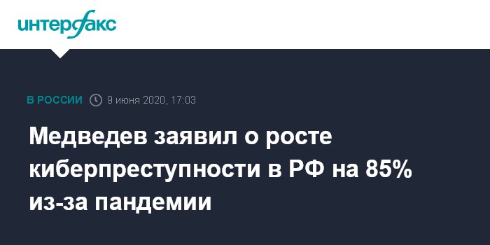 "Что закономерно привело к росту киберпреступности. За последние пять месяцев количество преступлений с использованием интернета, информационных технологий, мобильной связи составило более 80 тысяч, это приблизительно на 85% больше, чем за аналогичный период прошлого года", - отметил Медведев на совещании по вопросам общественной безопасности.