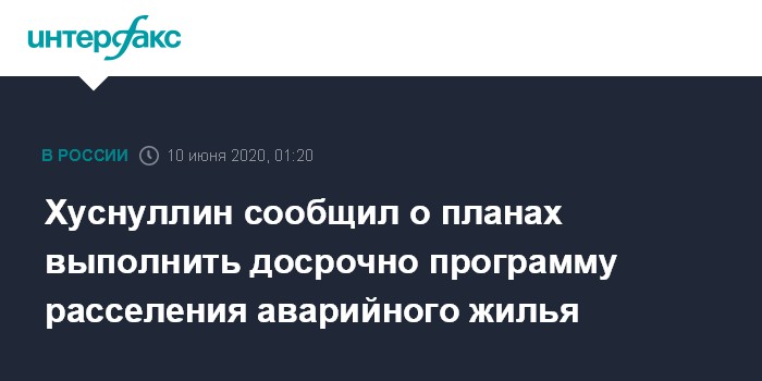 Москва. 10 июня. INTERFAX.RU - Правительство РФ планирует завершить расселение граждан по программе аварийного жилья на год раньше, рассказал заместитель председателя правительства РФ Марат Хуснуллин в программе "Право на справедливость" на Первом канале.
