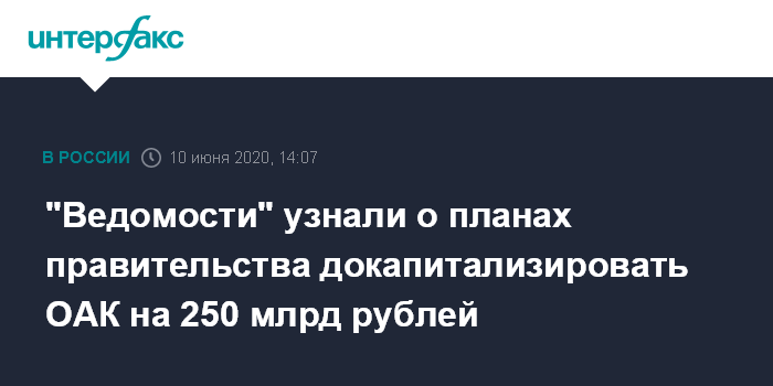 Москва. 10 июня. INTERFAX.RU - Программа финансового оздоровления "Объединенной авиастроительной корпорации" (ОАК) предусматривает ее докапитализацию на 250 млрд рублей из госбюджета, узнали "Ведомости". Эти деньги пойдут на погашения долгов ОАК перед банками, сообщили изданию три источника, близких к корпорации и федеральный чиновник.