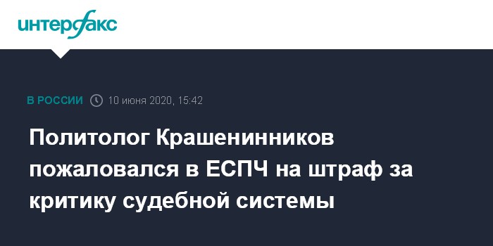 Москва. 10 июня. INTERFAX.RU - Политолог из Екатеринбурга Федор Крашенинников, которого в ноябре оштрафовали на 30 000 рублей за проявление неуважения к судьям, пожаловался в Европейский суд по правам человека (ЕСПЧ), сообщил глава Международной правозащитной группы "Агора" Павел Чиков.