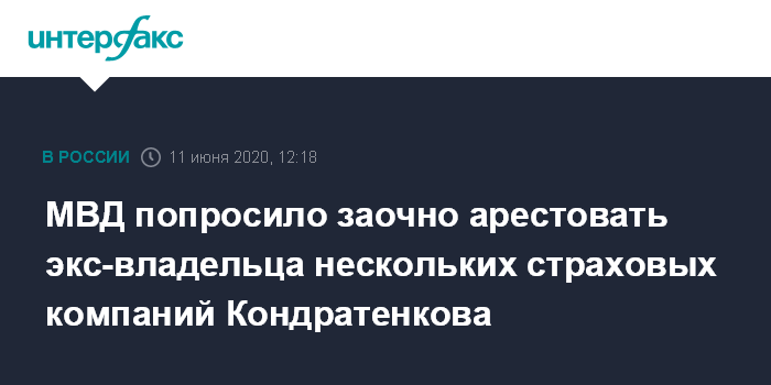 Москва. 11 июня. INTERFAX.RU - Следователь МВД попросил Тверской суд заочно арестовать бывшего владельца нескольких страховых компаний Александра Кондратенкова, которого обвиняют в хищении более 67 млн рублей по фиктивным документам. В пресс-службе суда сообщили, что ходатайство будет рассмотрено 16 июня.