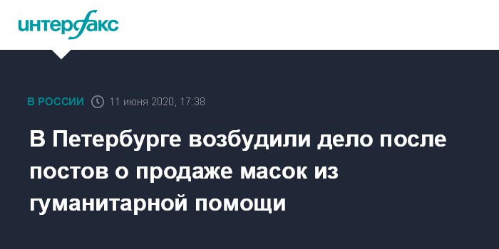 Москва. 11 июня. INTERFAX.RU - В Петербурге возбудили уголовное дело по фактам публикации в соцсетях постов о продаже в сетевом магазине китайских масок, якобы не подлежащих продаже и присланных в Россию в качестве гуманитарной помощи.