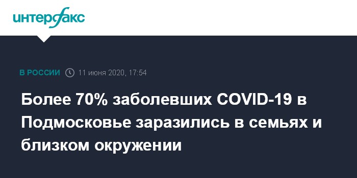 Москва. 11 июня. INTERFAX.RU - Более 70% заболевших коронавирусной инфекцией жителей Московской области заразились в кругу семьи и близком окружении, заявила в четверг руководитель управления Роспотребнадзора по региону Ольга Микаилова.