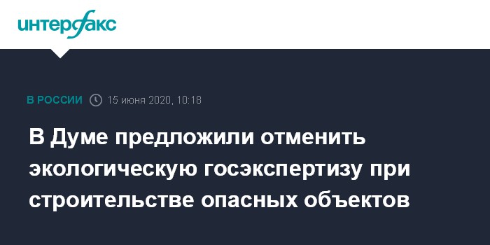 Москва. 15 июня. INTERFAX.RU - Депутаты Госдумы ко второму чтению законопроекта об ускорении приоритетных строек РЖД предложили включить в него поправки в закон "Об экологической экспертизе" и отменить обязательную государственную экологическую экспертизу (ГЭЭ) проектных документов по строительству наиболее экологически опасных объектов. О появлении поправок пишет "Коммерсантъ".