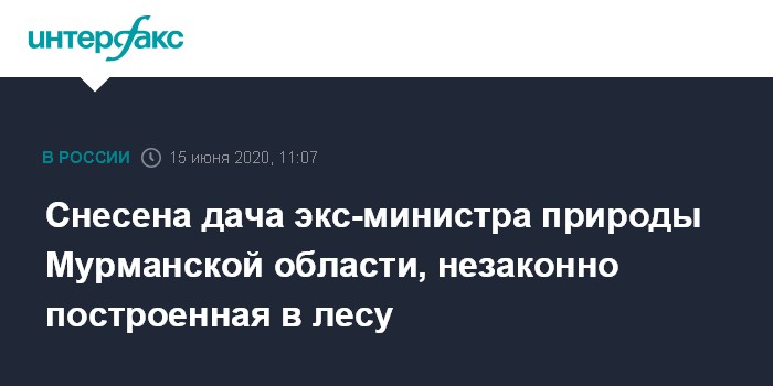 Москва. 15 июня. INTERFAX.RU - В Кольском районе Мурманской области по решению суда снесли незаконно построенные дачи бывшего министра природы региона Эльвиры Макаровой и бывшего начальника отдела природопользования министерства Игоря Конюхова, убедилась прокуратура региона.