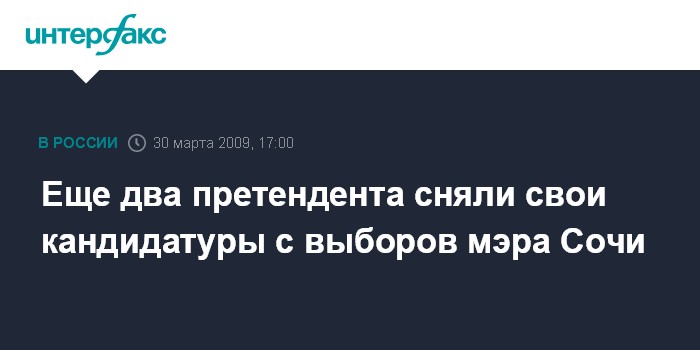 "Заявления о снятии своей кандидатуры в избирательную комиссию поступили от временно неработающего Юрия Данилевского и от генерального директора ООО "Южная строительная компания" Анатолия Паршина", - заявил на заседании избирательной комиссии секретарь комиссии Валентина Ткачева. Она также отметила, что извещение о недостатках, выявленных при проверке документов, необходимых для регистрации претендентов в качестве кандидатов, получили генеральный директор ООО "Домостроительный комбинат "Адлер" Владимир Рябцев, депутат муниципального образования "Округ Петровский" из Санкт-Петербурга Дмитрий Ильковский, депутат городского собрания Сочи, глава местного отделения партии "Справедливая Россия" Виктор Курпитко.