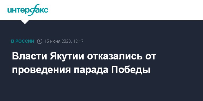 Москва. 15 июня. INTERFAX.RU - Парад Победы не будут проводить в Якутске 24 июня, вместо него пройдут онлайн-мероприятия, сообщили "Интерфаксу" в пресс-службе правительства региона.