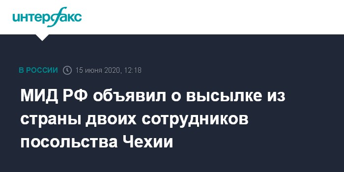 "Руководствуясь принципом взаимности, а также статьей 9 Венской конвенции о дипломатических сношениях 1961 года, "персона нон-грата" объявлены два сотрудника посольства Чехии в Москве. Им предписано вместе с членами семей покинуть территорию Российской Федерации до конца дня 17 июня с.г.", - говорится в сообщении российского внешнеполитического ведомства, опубликованном в понедельник.