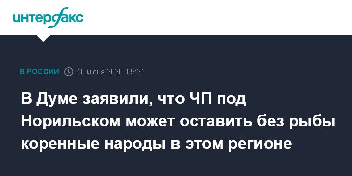 Москва. 16 июня. INTERFAX.RU - Экологическая катастрофа под Норильском может оставить без рыбы местных жителей, традиционно выходящих осенью на промысел, считает президент Ассоциации коренных малочисленных народов Севера, Сибири и Дальнего Востока, депутат Госдумы РФ Григорий Ледков.