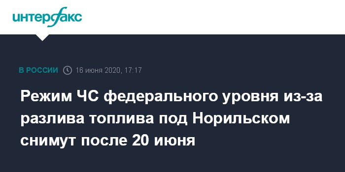 Москва. 16 июня. INTERFAX.RU - Федеральный уровень ЧС будет снят в районе разлива топлива под Норильском после 20 июня, работы продолжаться на региональном уровне, сообщил журналистам губернатор Красноярского края Александр Усс.