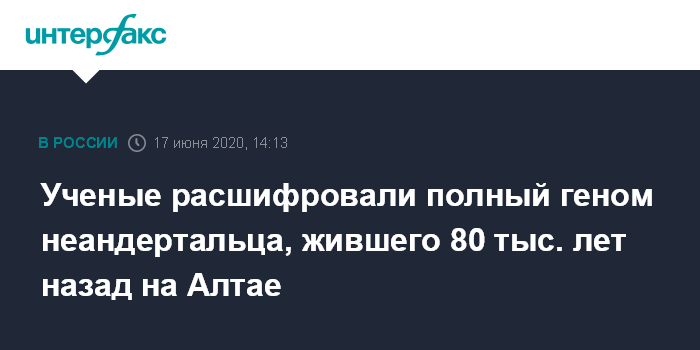 Москва. 17 июня. INTERFAX.RU - Международный коллектив ученых под руководством генетика Фабрицио Мафессони из Института эволюционной антропологии Макса Планка (Лейпциг) расшифровали полный геном неандертальца, обитавшего 80 тысяч лет назад в Чагырской пещере на Алтае. Статья об этом вышла 16 июня в американском научном журнале PNAS (Proceedings of the National Academy of Sciences).