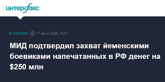 Москва. 17 июня. INTERFAX.RU - Официальный представитель МИД РФ Мария Захарова подтвердила информацию о том, что в Йемене боевики напали на правительственный конвой и захватили отпечатанные в России банкноты на сумму 64 млрд риалов ($255 млн).
