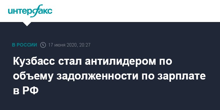 Просроченная задолженность по заработной плате в России на 1 июня 2020 года составила 2 млрд 415,9 млн рублей, из них 479,8 млн рублей пришлось на Кузбасс (вся сумма при этом была по подразделу "из-за отсутствия собственных средств у предприятий").