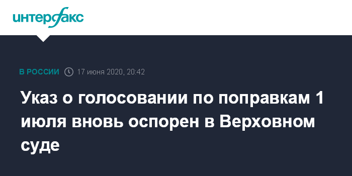 Москва. 17 июня. INTERFAX.RU - Верховный суд России зарегистрировал административный иск, оспаривающий указ президента о проведении 1 июля голосования по внесению поправок в Конституцию.