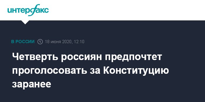 Москва. 18 июня. INTERFAX.RU - Проголосовать по поправкам в Конституцию 1 июля, в официальный день голосования, планируют 53% россиян, предпочтут это сделать заранее, с 25 по 30 июня - 25%, показал опрос ВЦИОМа, проведенный 15 июня 2020 года по телефону среди 1600 взрослых респондентов.