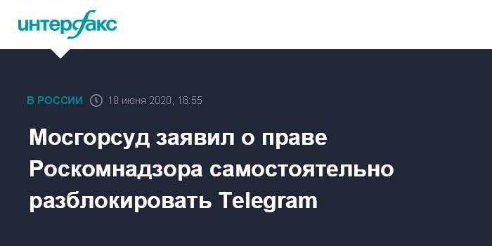 Москва. 18 июня. INTERFAX.RU - Роскомнадзор вправе самостоятельно принимать решение об исполнении или неисполнении решения суда, который ранее по требованию службы разрешил заблокировать Telegram, объяснила "Интерфаксу" пресс-секретарь Мосгорсуда Ульяна Солопова.