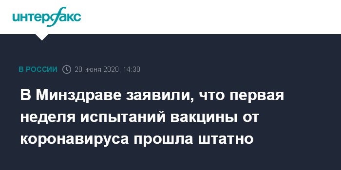 Москва. 20 июня. INTERFAX.RU - Клинические испытания вакцины от новой коронавирусной инфекции идут уже неделю в штатном режиме, сообщил журналистам министр здравоохранения РФ Михаил Мурашко.