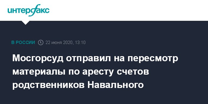 Москва. 22 июня. INTERFAX.RU - Мосгорсуд отменил и отправил на пересмотр вопрос об аресте банковских счетов родственников политика Алексея Навального и главы Фонда борьбы с коррупцией Ивана Жданова в рамках уголовного дела об отмывании денежных средств.