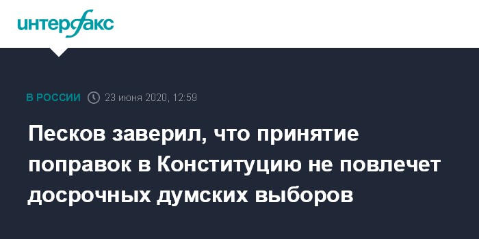 Москва. 23 июня. INTERFAX.RU - Вступление в силу конституционных поправок не потребует проведения досрочных выборов в Госдуму или переназначений на ключевых постах, заявил пресс-секретарь президента Дмитрий Песков.