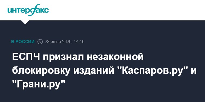Москва. 23 июня. INTERFAX.RU - Европейский суд по правам человека счел незаконной досудебную блокировку интернет-изданий "Грани.ру", "Каспаров.ру" и "Ежедневный журнал". Он присудил по 10 000 евро их издателям - ООО "Флавус", Гарри Каспарову и ООО "Медиафокус".