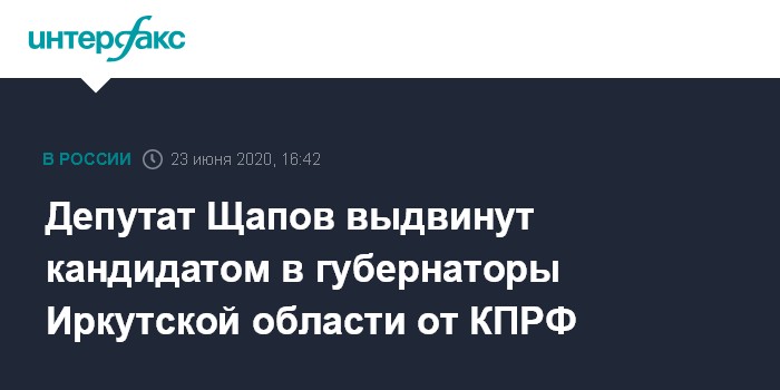 Москва. 23 июня. INTERFAX.RU - Кандидатура депутата Госдумы Михаила Щапова выдвинута иркутским обкомом на пост губернатора области, заявил "Интерфаксу" зампред ЦК КПРФ Юрий Афонин.