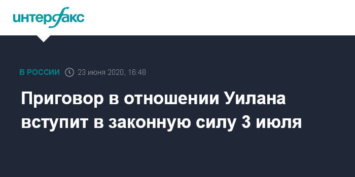 "Перевод приговора Уилан получил только вчера, поэтому если жалоб и представлений на приговор от него, защиты или прокурора не поступит, то в силу приговор вступит 3 июля", - сообщили "Интерфаксу" в Мосгорсуде.