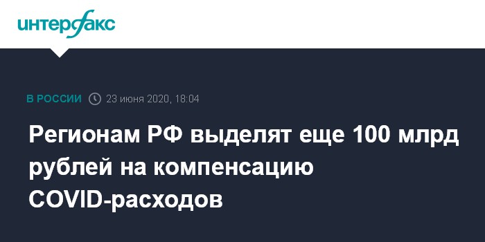 Москва. 23 июня. INTERFAX.RU - Правительство РФ выделит дополнительно 100 млрд рублей регионам на компенсацию расходов, связанных с реализацией мер по борьбе с коронавирусом, заявил президент РФ Владимир Путин.