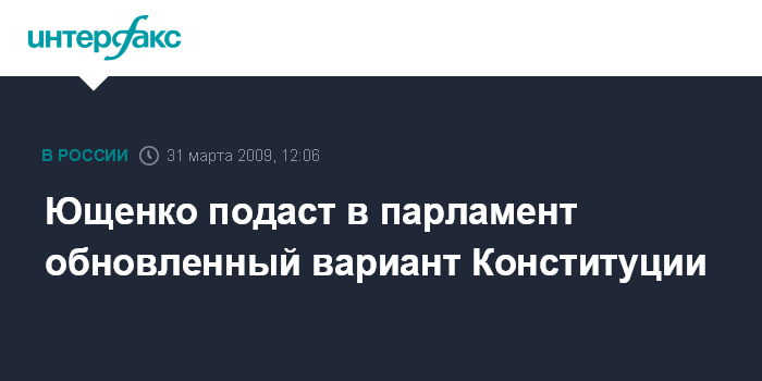 Москва. 31 марта. INTERFAX.RU - Президент Украины Виктор Ющенко намерен во вторник передать председателю Верховной Рады проект изменений в Конституцию страны.