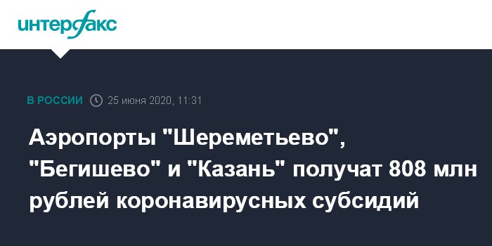 Москва. 25 июня. INTERFAX.RU - Росавиация сообщила, что одобрила заявки на субсидии для покрытия коронавирусных потерь аэропортам "Шереметьево", "Бегишево" и "Казань". Они получат 808,1 млн рублей.