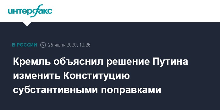 Москва. 25 июня. INTERFAX.RU - В Кремле пояснили, почему президент инициировал внесение поправок в Конституцию, хотя ранее заявлял о нецелесообразности изменений в Основном законе: назрела возможность внесения субстантивных поправок в Конституцию, ранее речь шла только о поправках, связанных с новым президентским сроком Владимира Путина.