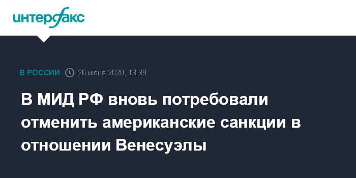 Москва. 26 июня. INTERFAX.RU - Россия в ответ на призыв США нарастить помощь Венесуэле для борьбы с коронавирусом настаивает на отмене американских санкций в отношении Каракаса, заявил "Интерфаксу" директор латиноамериканского департамента МИД РФ Александр Щетинин.