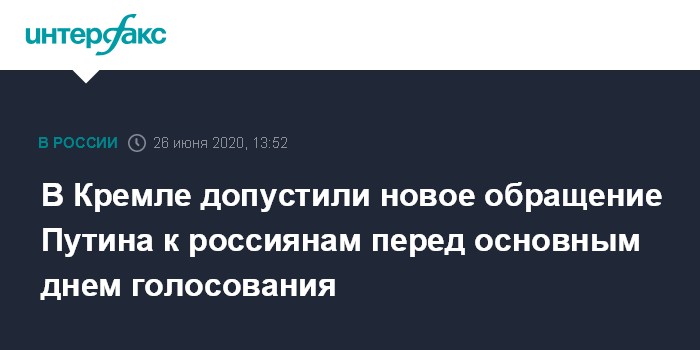 Москва. 26 июня. INTERFAX.RU - Президент РФ Владимир Путин может выступить с обращением к россиянам перед основным днем голосования по поправкам в Конституцию - 1 июля, сообщил пресс-секретарь главы государства Дмитрий Песков.