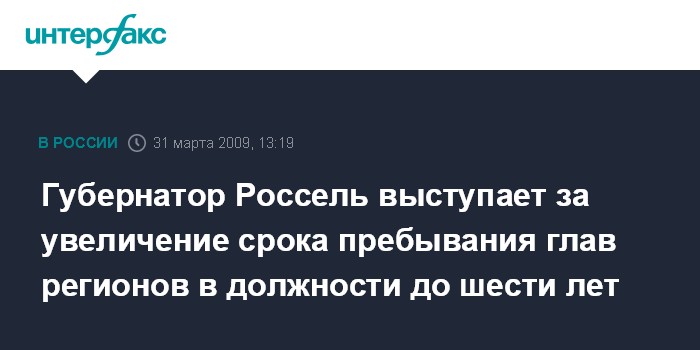 Москва. 31 марта. INTERFAX.RU - Глава Свердловской области Эдуард Россель считает целесообразным продление срока пребывания губернаторов в должности до шести лет. "Если срок президента увеличен до шести лет, было бы логично продлить срок губернаторов тоже до шести лет, потому что губернаторы и президент - единая команда исполнительной власти", - заявил Россель на пресс-конференции во вторник.