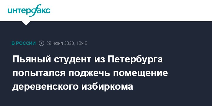 Москва. 29 июня. INTERFAX.RU - Во Всеволожском районе Ленинградской области пьяный студент пытался устроить пожар в помещении участковой избирательной комиссии (УИК) № 139, сообщил "Интерфаксу" в понедельник информированный источник.