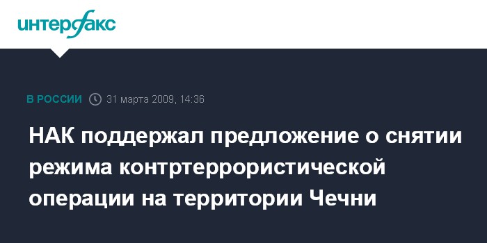 Москва. 31 марта. INTERFAX.RU - Предложение об отмене режима контртеррористической операции (КТО) на территории Чечни получило поддержку Национального антитеррористического комитета (НАК), сообщил президент республики Рамзан Кадыров. "НАК поддержал это предложение. После прохождения необходимых процедур оно будет доложено президенту России для принятия решения", - сказал во вторник "Интерфаксу" Кадыров по итогам заседания НАК, в котором он принял участие.