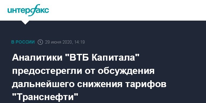 Москва. 29 июня. INTERFAX.RU - Аналитики "ВТБ Капитала" считают дальнейшее обсуждение вопроса снижения тарифов "Транснефти" негативным для восприятия акций компании. Это говорится в обзоре инвестбанка.