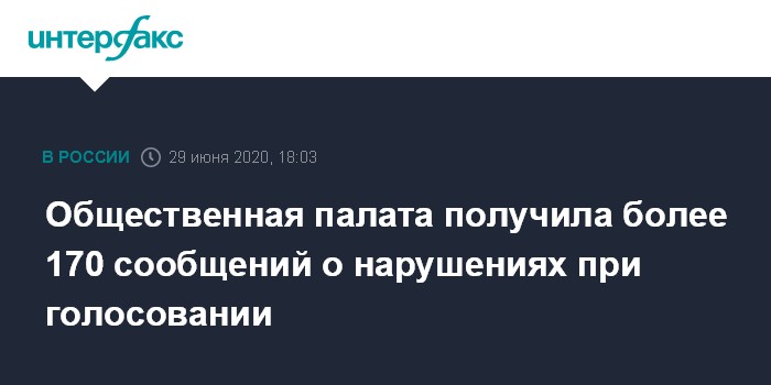 Москва. 29 июня. INTERFAX.RU - Общественная палата РФ получила более 170 сообщений от наблюдателей и региональных общественных палат по поводу несоответствия проведения голосования выработанному вместе с ЦИК России "золотому стандарту", сообщила секретарь ОП РФ Лидия Михеева.