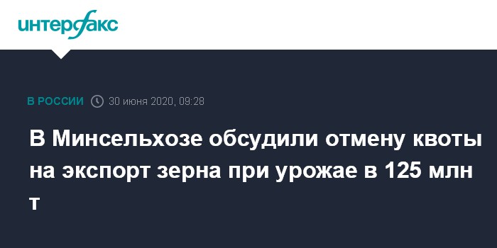 Москва. 30 июня. INTERFAX.RU - Россия в новом сельхозгоду (июль 2020-июнь 2021 гг.) может отказаться от квоты на экспорт зерна, если получит урожай не менее 125 млн тонн и при экспортном потенциале в 45 млн тонн. Об этом сообщают "Ведомости" со ссылкой на двух человек, близких к двум компаниям-экспортерам, со ссылкой на Минсельхоз.