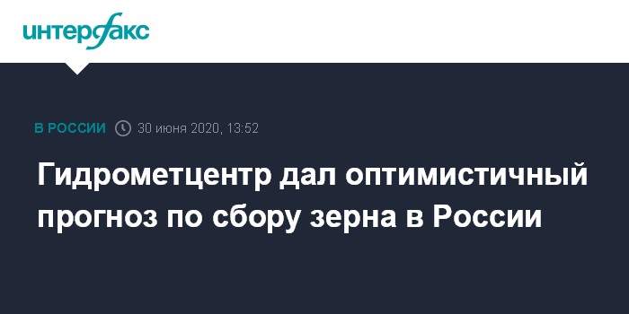 Москва. 30 июня. INTERFAX.RU - Валовый сбор зерновых культур в России прогнозируется выше среднего значения за последние пять лет, заявил научный руководитель Гидрометцентра РФ Роман Вильфанд.