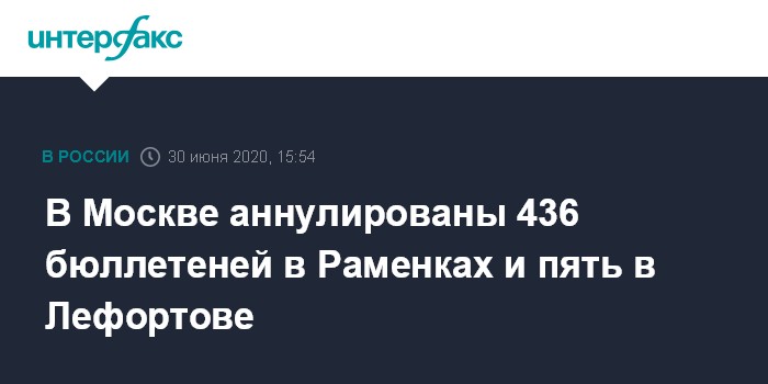 Москва. 30 июня. INTERFAX.RU - Мосгоризбирком МГИК аннулировал 436 бюллетеней в Раменках и сейф-пакет в Лефортове из-за выявленных нарушений в ходе надомного голосования по поправкам в Конституцию.