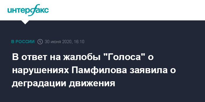 Москва. 30 июня. INTERFAX.RU - Движение в защиту прав избирателей "Голос" заявило о нарушениях на голосовании по Конституции и о многочисленных попытках помешать наблюдателям и организаторам наблюдения. Председатель Центризбиркома Элла Памфилова на это заявила, что организация деградировала и стала токсичной.