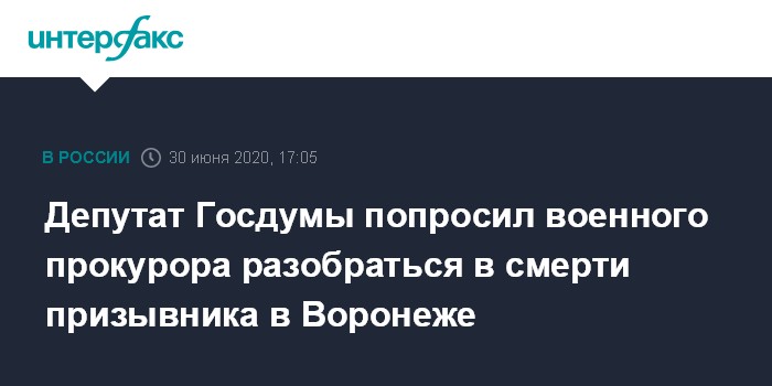 Москва. 30 июня. INTERFAX.RU - Депутат Госдумы от Иркутской области Александр Якубовский обратился в Главную военную прокуратуру с просьбой проверить обстоятельства гибели солдата-срочника в Воронеже и работу следствия.