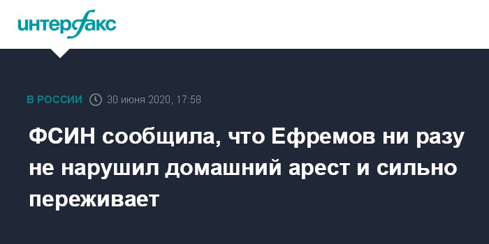 Москва. 30 июня. INTERFAX.RU - Обвиняемый в смертельном ДТП актер Михаил Ефремов добросовестно соблюдает режим содержания под домашним арестом. Об этом сообщил глава столичного управления Федеральной службы исполнения наказаний (ФСИН) Сергей Мороз.