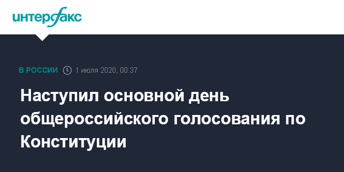 Москва. 1 июля. INTERFAX.RU - В среду, 1 июля, в России пройдет основной день голосования по внесению поправок в Конституцию РФ.
