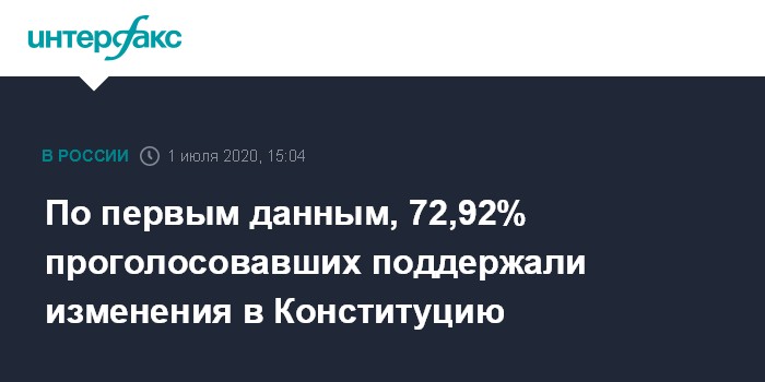 По первым данным, 72,92% проголосовавших поддержали изменения в Конституцию